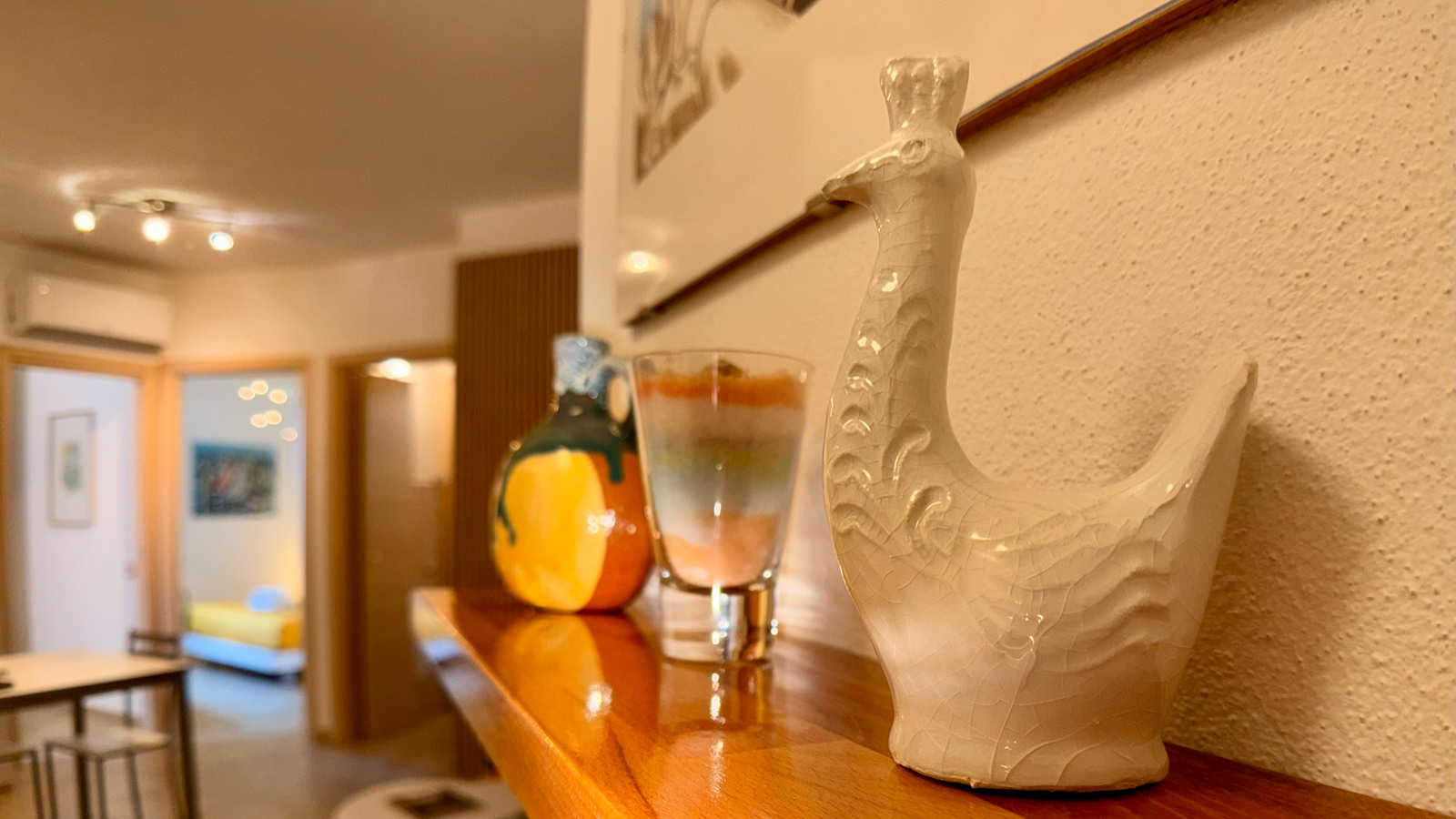 Modern first-floor apartment featuring a spacious living room/kitchen, 1 double bedroom, a walk-in closet with a desk area, a shaded and equipped small terrace, air conditioning, Smart TV, and Wi-Fi.